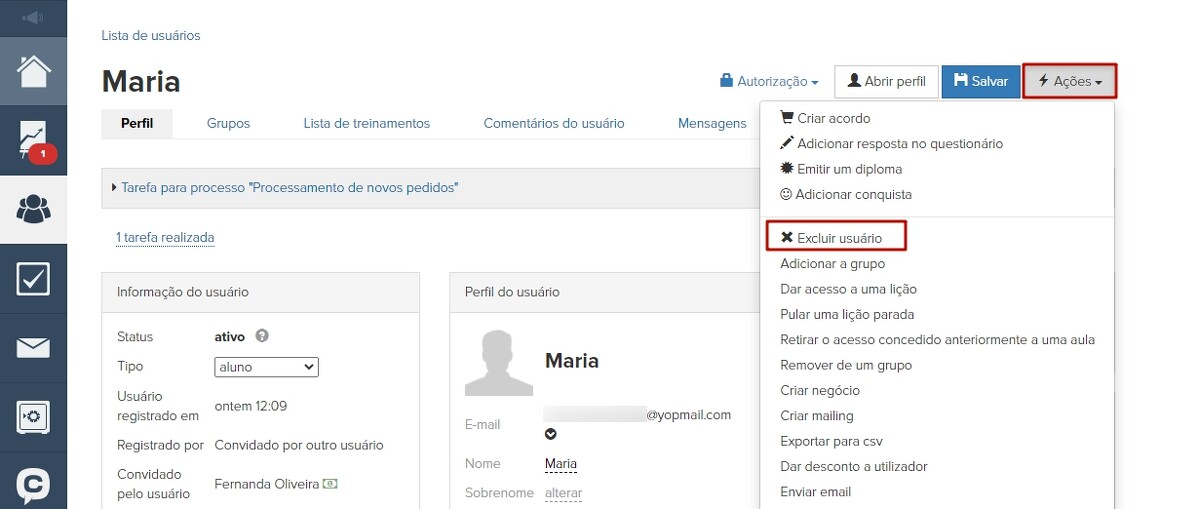 Você pode excluir um usuário individual em seu perfil usando o botão "Ações" - "Excluir usuário".