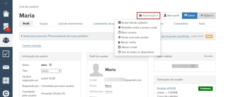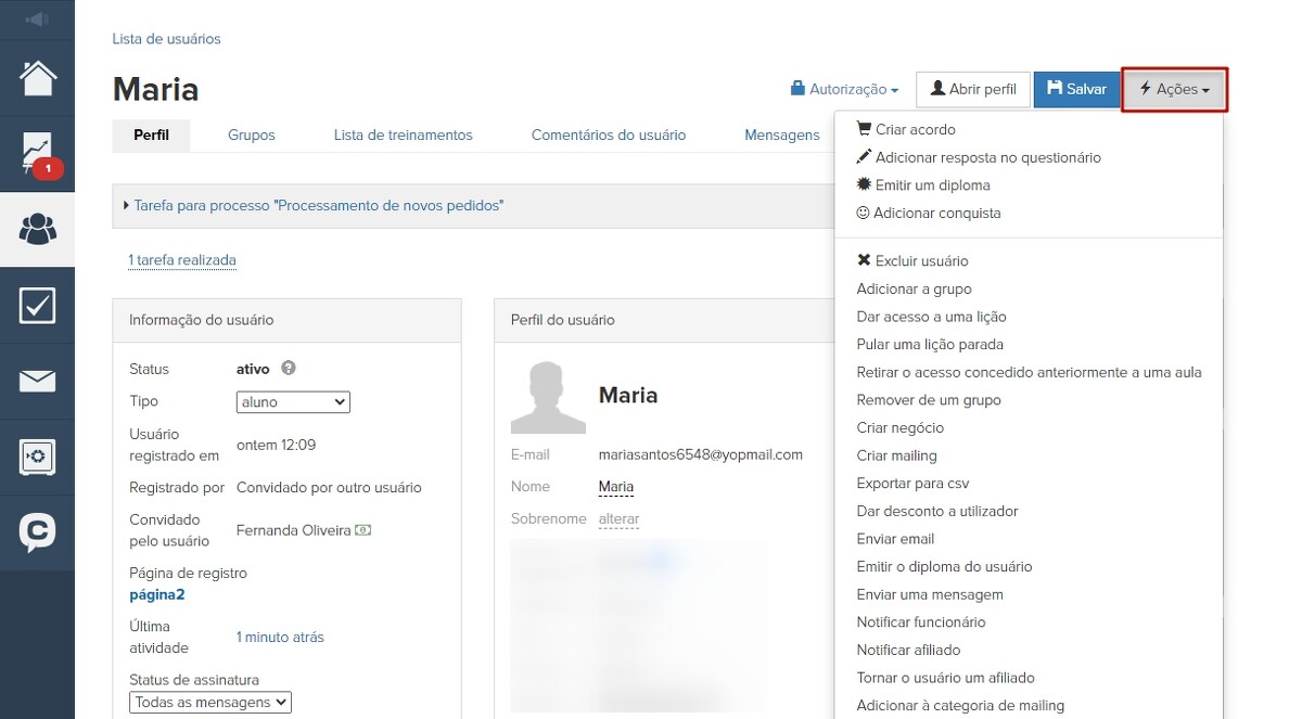 Existe o botão "Ações" com o qual você pode executar ações com o usuário no sistema (por exemplo, criar um pedido, adicionar a um grupo, dar acesso a uma aula oculta).