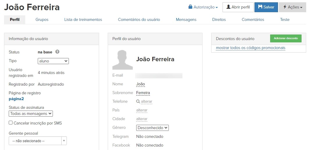 7. Descontos do usuário. Se o usuário tiver um código promocional ou já o tiver aplicado, essas informações serão exibidas neste campo. Também aqui você pode dar ao usuário um código promocional clicando no botão "Adicionar desconto".