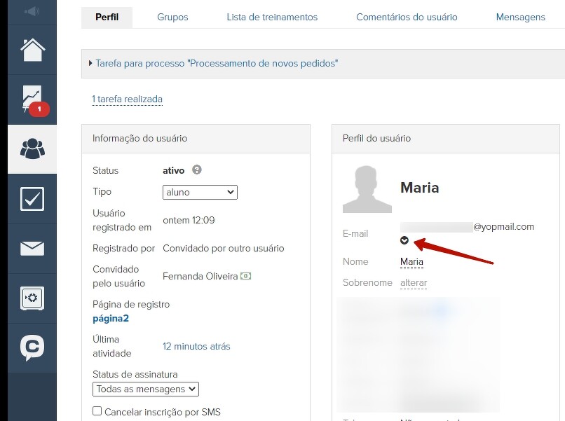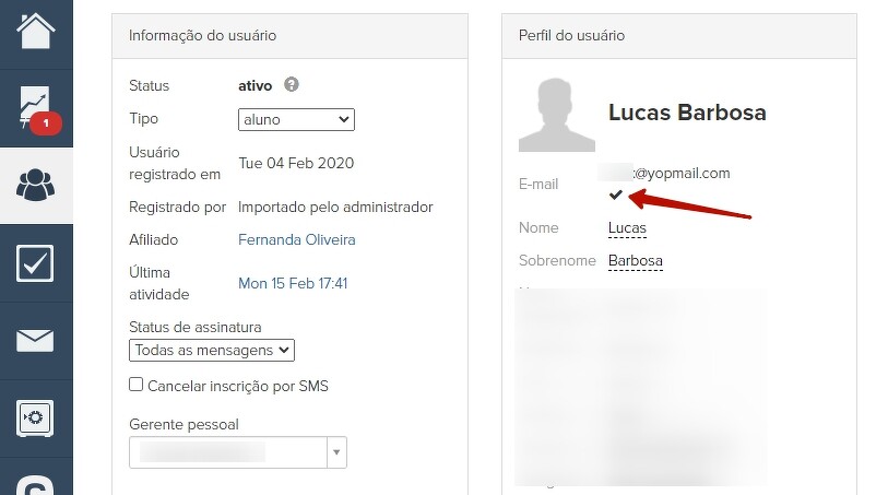 Nesta seção, você pode ver o status do endereço de e-mail do usuário: existente, confirmado.