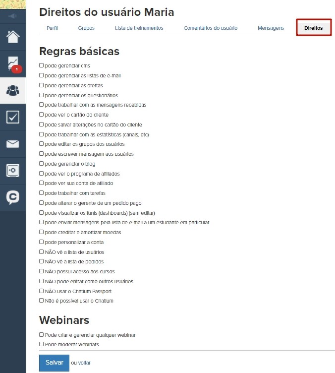 - Direitos - informações sobre os direitos do funcionário ou administrador. Nesta aba, você pode especificar quais ações um usuário pode executar em sua conta. Saiba mais sobre os direitos dos usuários neste artigo.