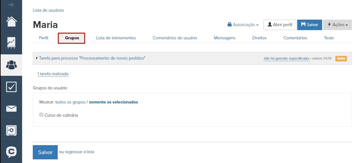 - Grupos - informações sobre os grupos do usuário. Aqui você pode adicionar ou remover manualmente um usuário de um grupo.