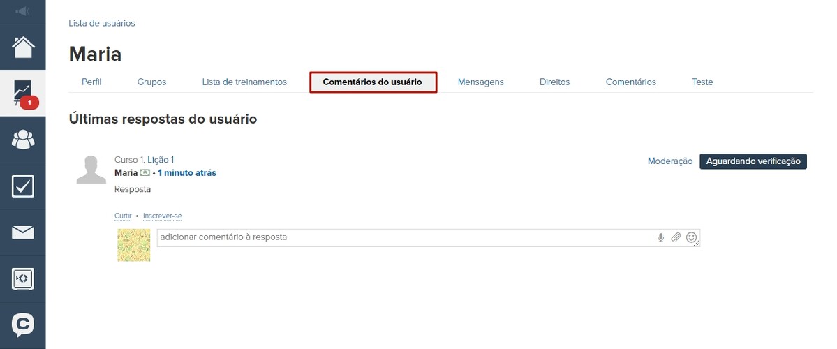 - Tarefas - respostas e comentários do usuário nas aulas e seus status.