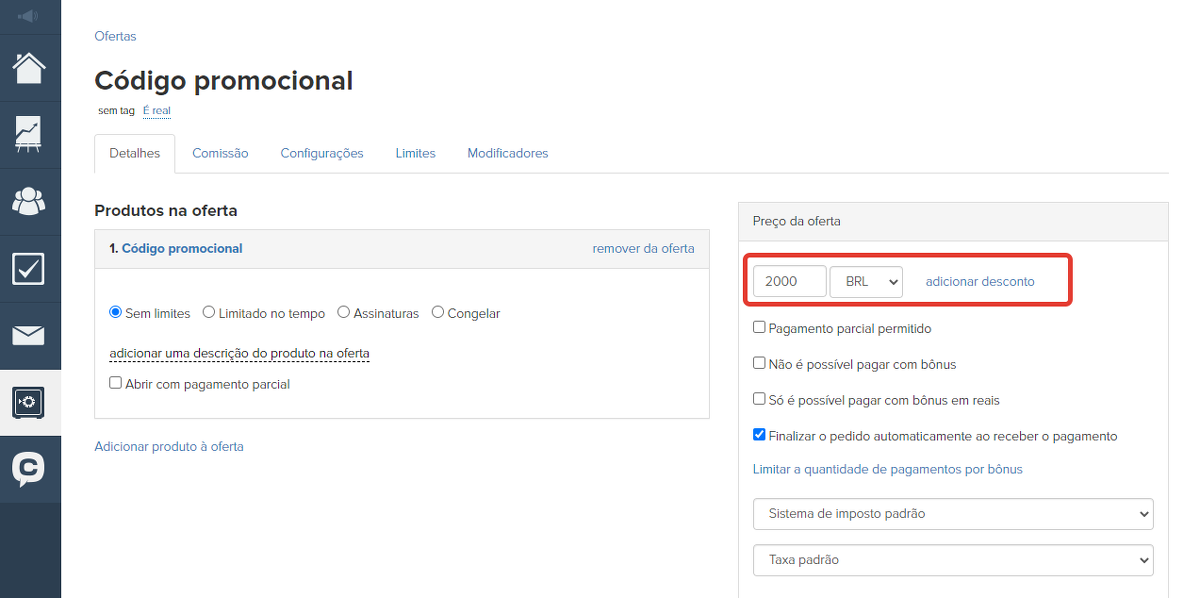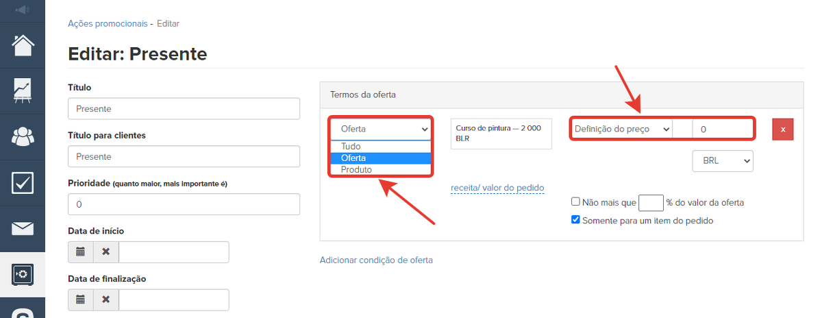 3. Para este produto, crie uma nova oferta e especifique o preço dela. O código promocional recebido ao comprar esta oferta dará um desconto igual ao valor especificado da oferta. Se o custo do desconto do código promocional for igual ao custo do curso, ao inserir esse código promocional, o usuário receberá o curso gratuitamente (como presente).