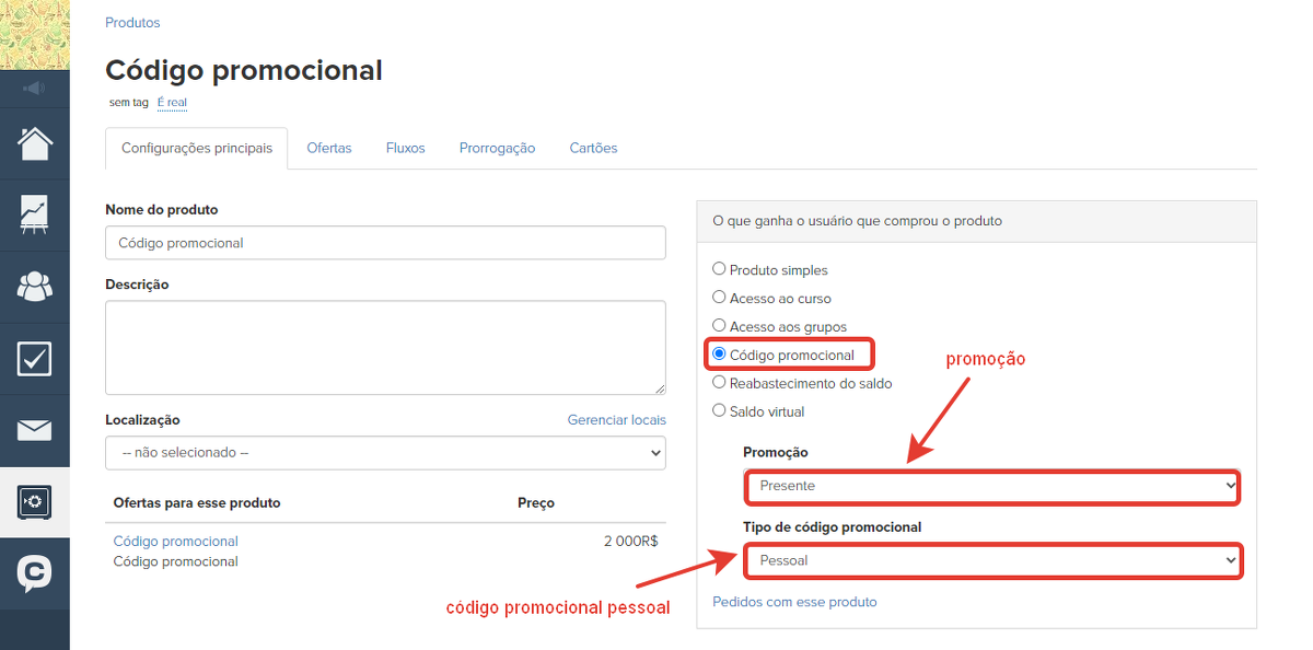 2. Crie um novo produto e selecione a promoção criada na etapa anterior. O usuário que comprou este produto receberá um código promocional pessoal, que poderá ser ativado na página de pagamento ou transferido para outra pessoa.