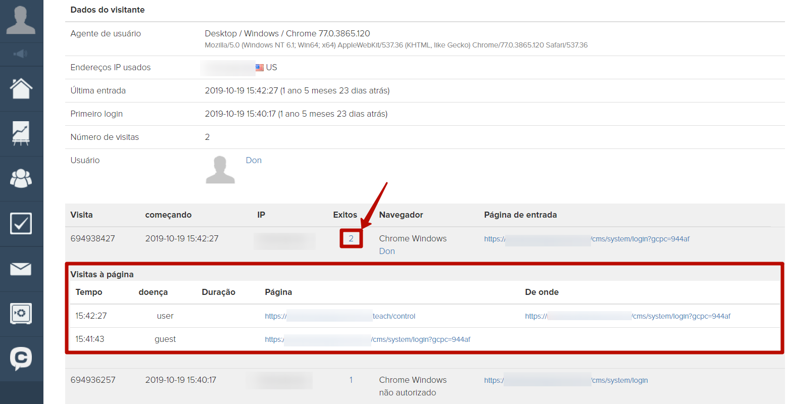 Aqui, você pode ver qual página o usuário acessou em um determinado momento, a partir de qual página foi encaminhado e o status do usuário no sistema: