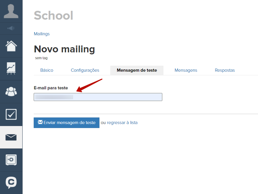 Quando a mensagem estiver pronta, ela poderá ser testada. Para fazer isso, na própria newsletter, vá para a aba "Mensagem de teste".