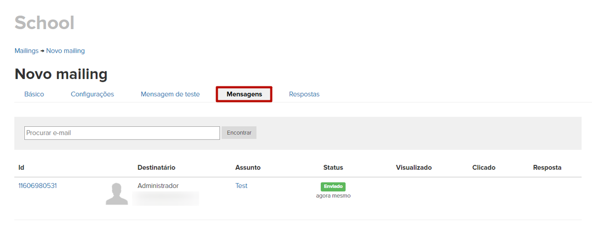 Depois que a mensagem de teste for enviada, você poderá visualizar seu status na aba "Mensagens".