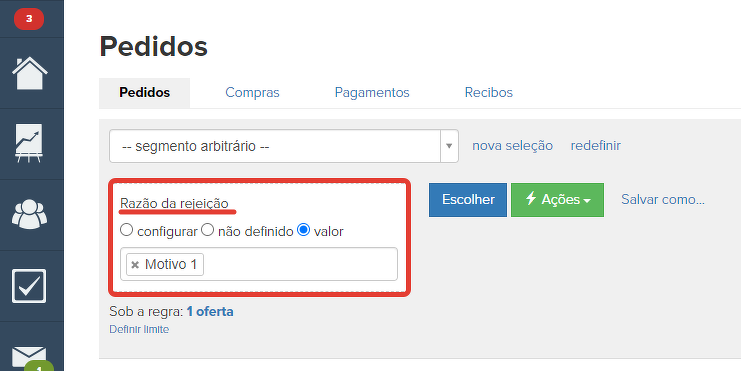 Depois que os motivos da recusa forem estabelecidos, será possível criar um segmento sob a condição "Razão da rejeição". Parâmetros adicionais estão disponíveis para a condição: "definido/não definido" ou a escolha de um conteúdo específico - motivos da recusa.