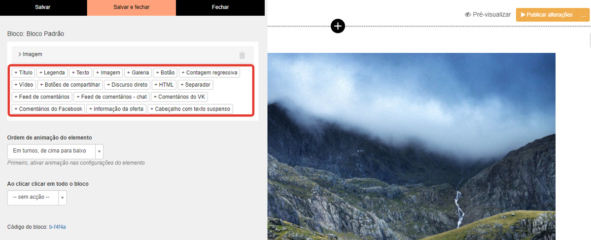 Qualquer um desses blocos pode ser preenchido com o conteúdo desejado, removendo e adicionando elementos nas configurações do bloco: