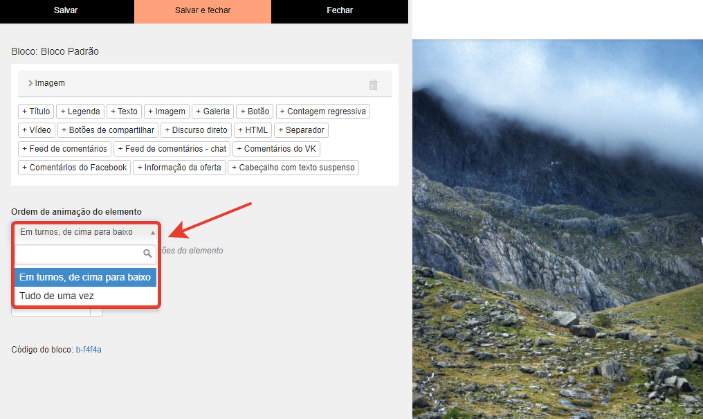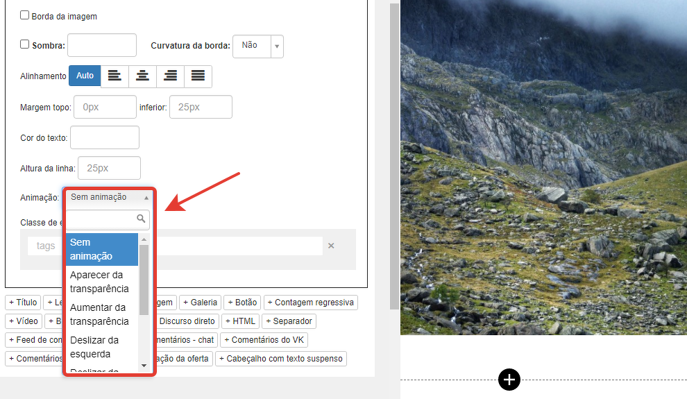 Para cada elemento em um bloco padrão, você pode configurar a exibição visual usando animações.