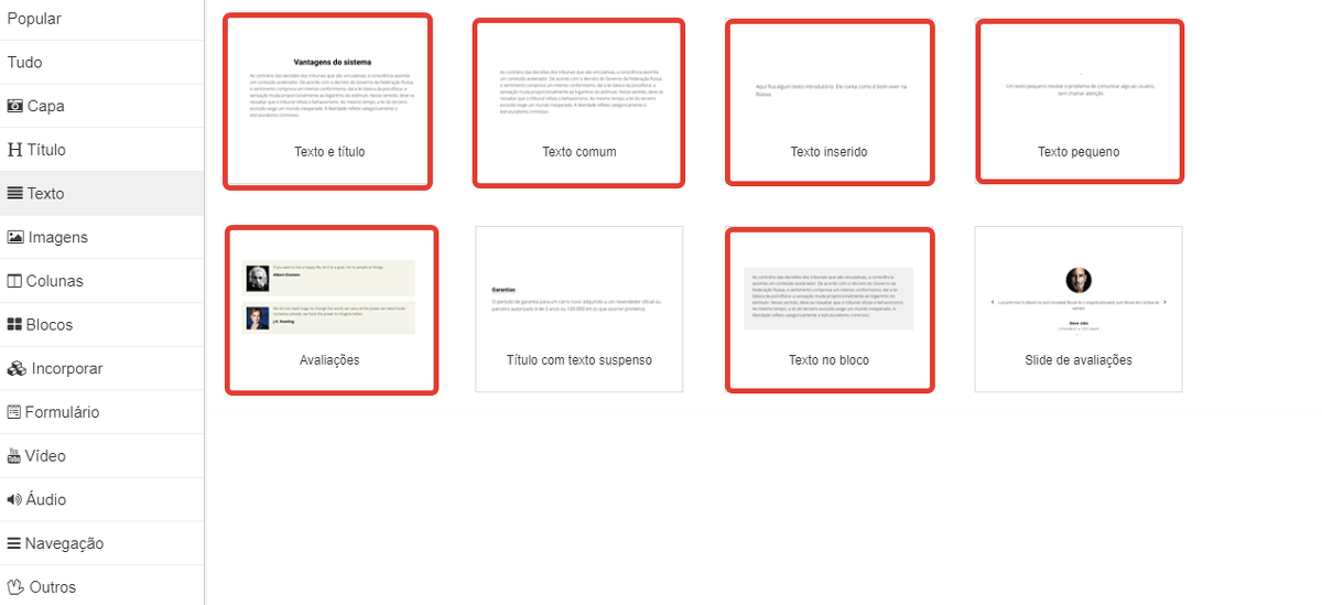 Você pode adicionar um bloco padrão a uma página selecionando qualquer um dos blocos a seguir na seção "Texto":