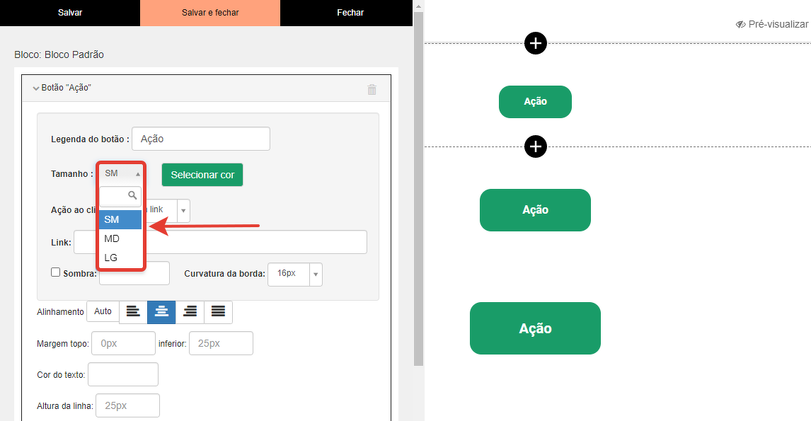 Para os botões, é possível definir o tamanho - small, medium, large: