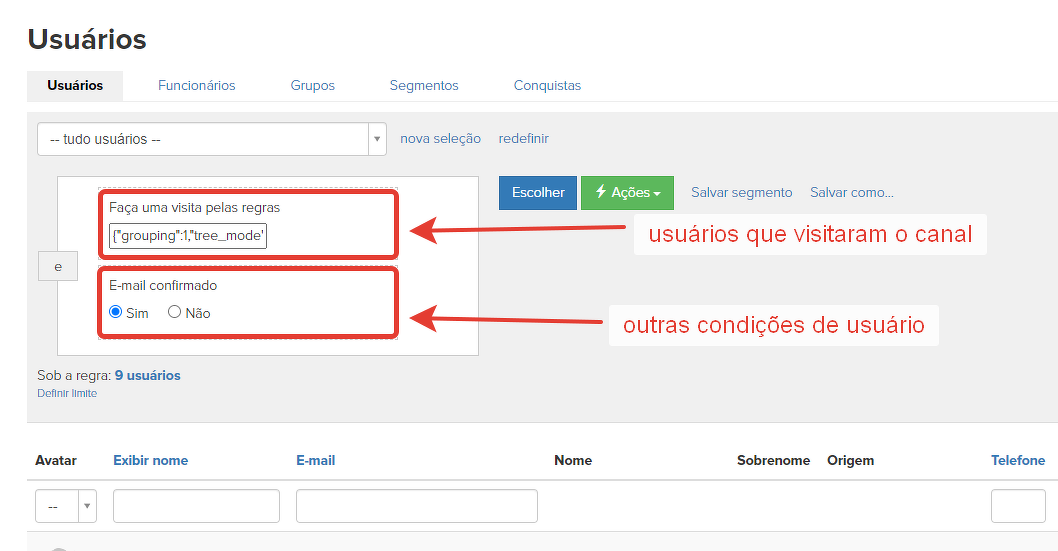 A seleção exibirá os usuários que visitaram o canal em questão de acordo com os parâmetros de relatório configurados. Além disso, para uma análise mais profunda dos dados do usuário, a amostra pode ser refinada usando outras condições de usuário disponíveis.