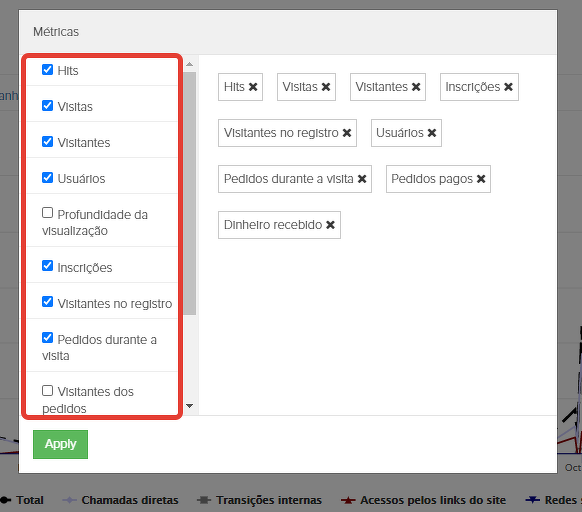 Para adicionar métricas a uma tabela, marque-as usando a caixa de seleção: