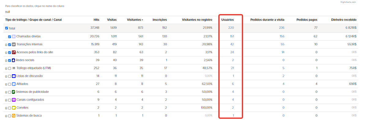 Na tabela, o número de usuários para cada fonte é clicável e permite que você vá para a seleção na seção "Usuários".