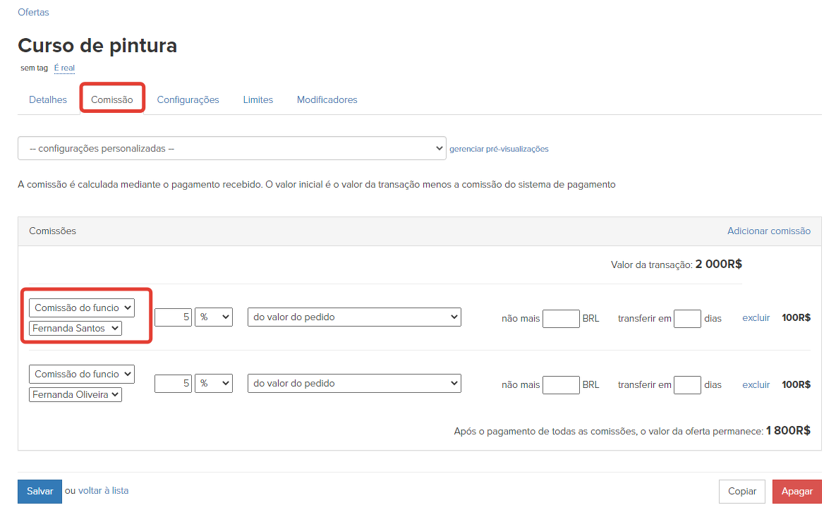 Ou seja, a comissão para um usuário do tipo "Funcionário" é definida precisamente nas ofertas onde ela deve ser calculada por ele. Em uma oferta, você pode definir comissões para diferentes funcionários em quantidades diferentes, de acordo com suas contribuições.