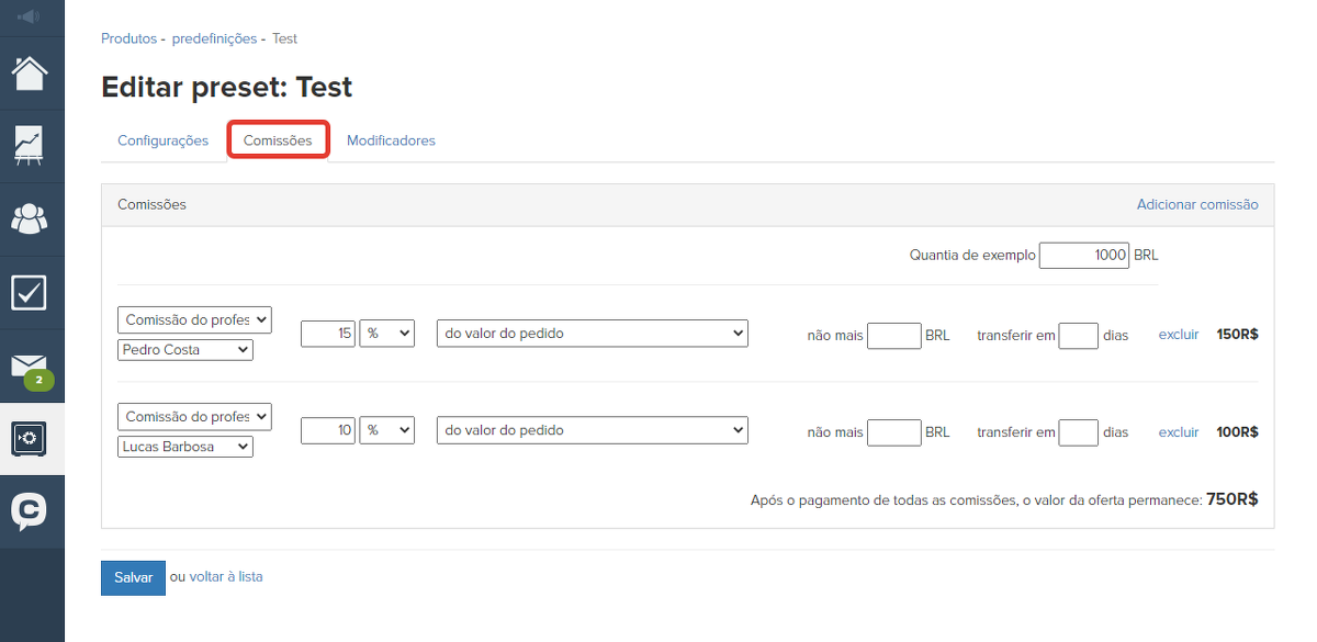 Portanto, se for necessário contabilizar outras comissões na oferta, todas elas devem ser especificadas na aba "Comissões" na própria oferta ou na predefinição em suas configurações.