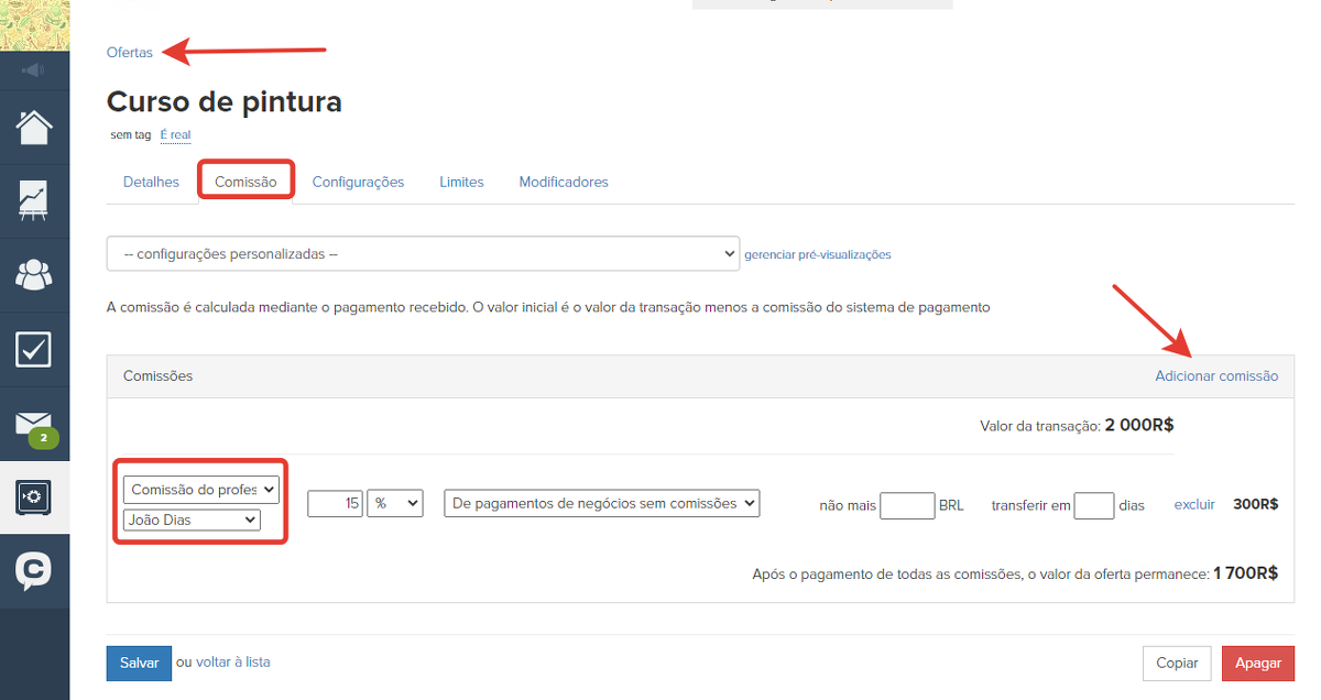 Analogamente, nas configurações de oferta, também se determina o valor da comissão para os funcionários. Para atribuir uma comissão a um professor, você precisa ir para a aba "Comissões" e clicar em "Adicionar comissão". Em seguida, selecione "Comissão de funcionários" na lista suspensa e selecione, abaixo da lista do funcionário, o tamanho da Comissão e suas outras configurações, se necessário.