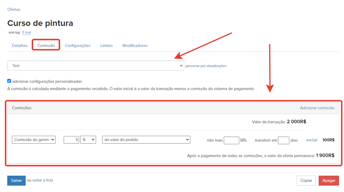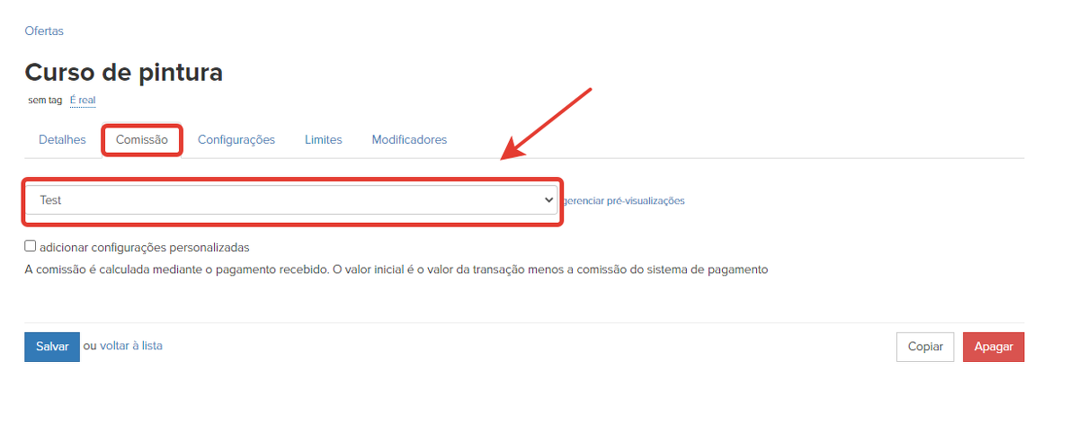 Depois disso, na aba "Comissões" na oferta, você precisa selecionar a predefinição.