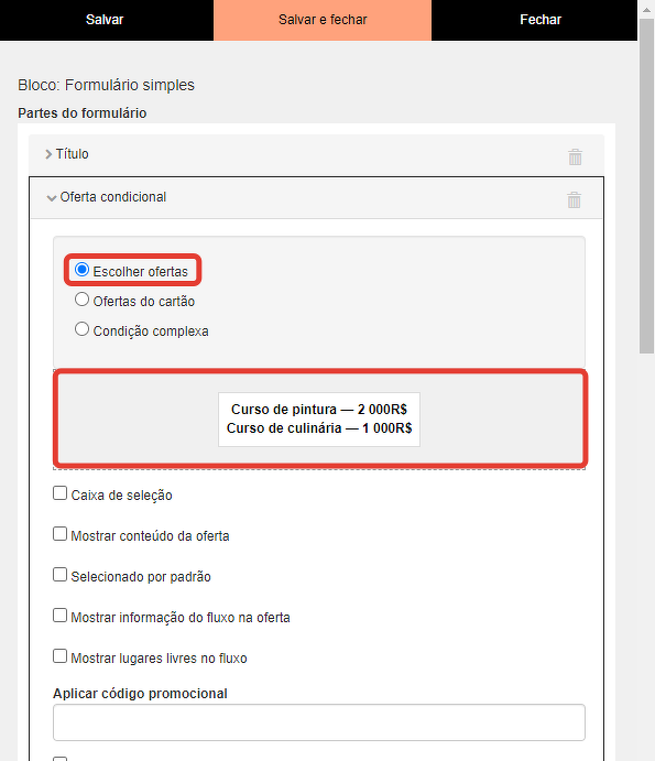 A opção "Ocultar formulário se não houver ofertas" ocultará o bloco com o formulário se o usuário não atender a nenhuma condição sob a qual as ofertas são exibidas ou se o usuário não estiver logado no site.