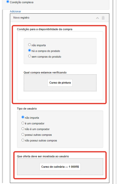 Atenção: a condição de verificação por compra e tipo de usuário só funciona se o usuário estiver logado na conta. Se o usuário não estiver logado, a condição não poderá ser verificada e as sugestões serão ocultas no formulário se houver condições complexas estabelecidas, independentemente de sua implementação. Para que as configurações de exibição de ofertas sob condição sejam executadas, o usuário deve primeiro fazer login.