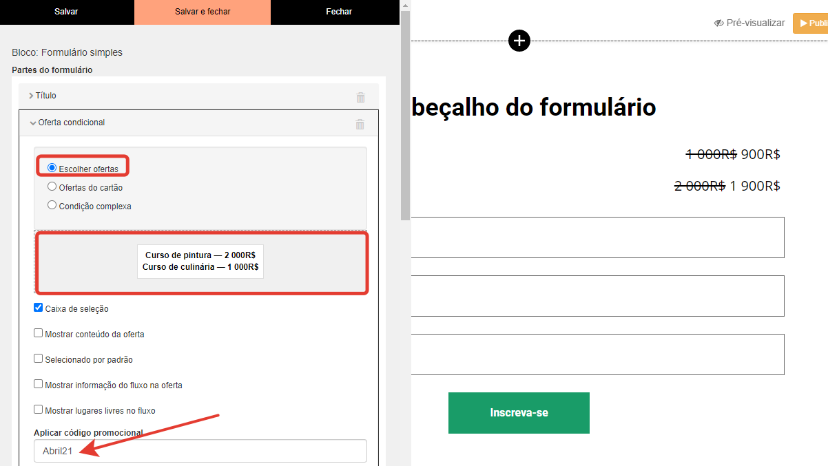 Para aplicar automaticamente o código promocional no formulário, você precisa selecionar as ofertas e inserir o nome do código promocional no campo "Aplicar código promocional".