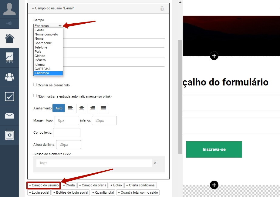 Para que o usuário preencha esses campos, você precisará adicionar o elemento "Campo do usuário" ao formulário.