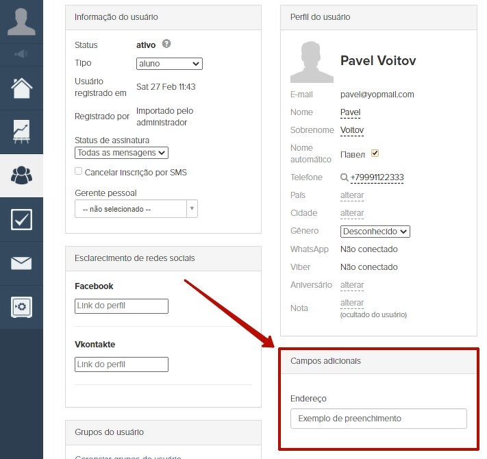 Os campos adicionais correspondentes com os dados preenchidos aparecem no perfil do usuário.