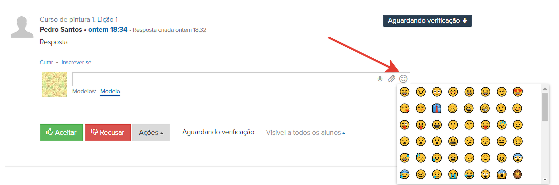 Recomendamos que você use a lista de emojis na caixa de resposta interna para responder a tarefas nas aulas e enviar comentários e mensagens na "Caixa de Entrada".