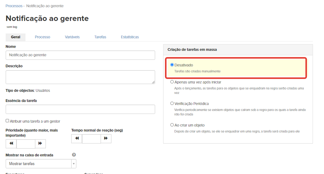 Como o processo será iniciado a partir do formulário, deixe-o como desligado: