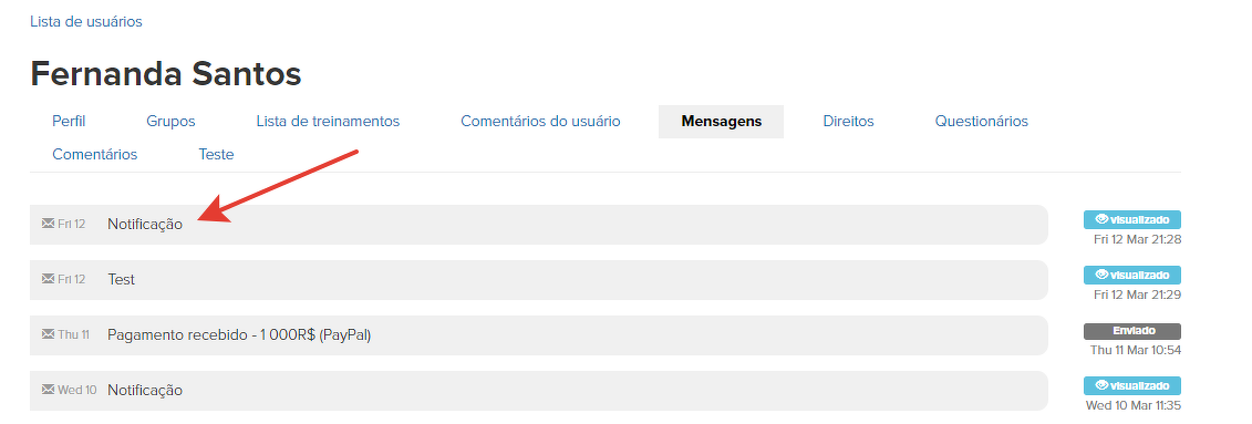 A notificação enviada pode ser vista no cartão do funcionário para o qual as notificações foram configuradas na aba "Mensagens".