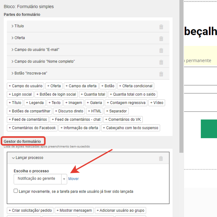 Em seguida, crie uma página com o formulário de inscrição; na ferramenta de formulário, especifique o processo que criou: