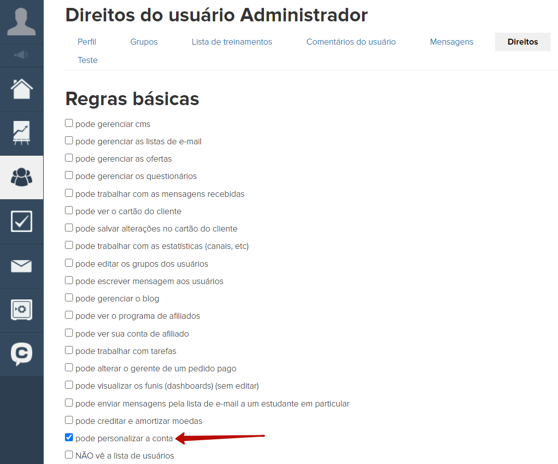 Para que o administrador também tenha acesso a essas configurações, é necessário dar a ele esse direito: