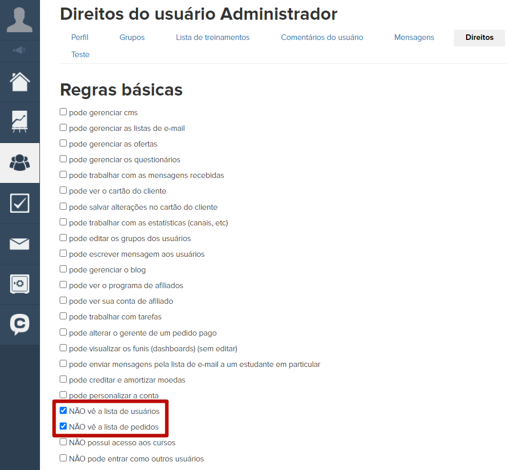 O proprietário também pode limitar os direitos do administrador de ver a lista de usuários e de pedidos. Estas restrições são boas para utilizar no trabalho com afiliados.