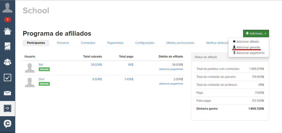 Para que o colaborador veja os pedidos e possa trabalhar com eles, ele precisa transformá-lo em gerente. Para isto, é necessário entrar no módulo "Vendas" - "Programa de afiliado" - botão "Adicionar" - "Adicionar gerente".