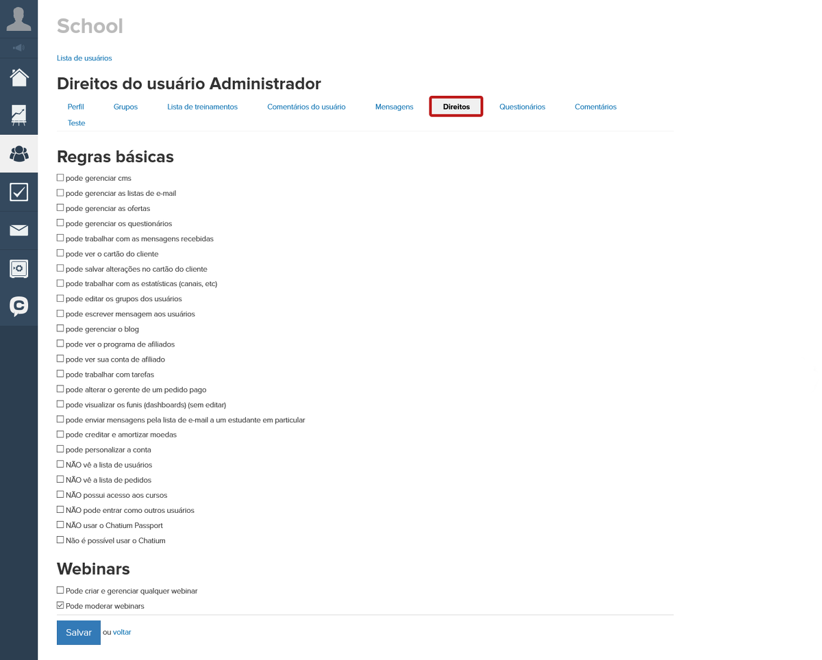 Dependendo da vertente de especialização do seu colaborador, você pode configurar direitos para ele. Para isto, você precisa acessar o perfil do colaborador na aba "Direitos" e selecionar quais direitos devem ser atribuídos a ele.