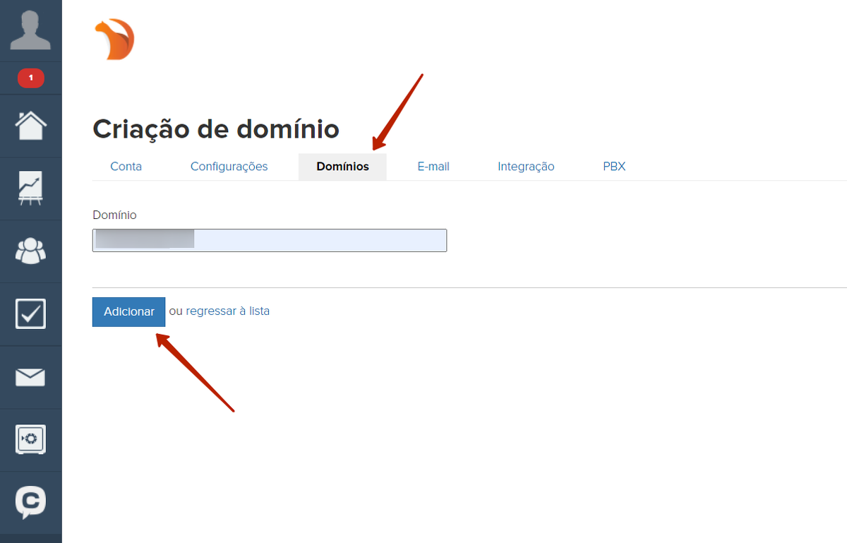 Na seção "Configurações da conta", "Domínios", adicione o domínio ao sistema.