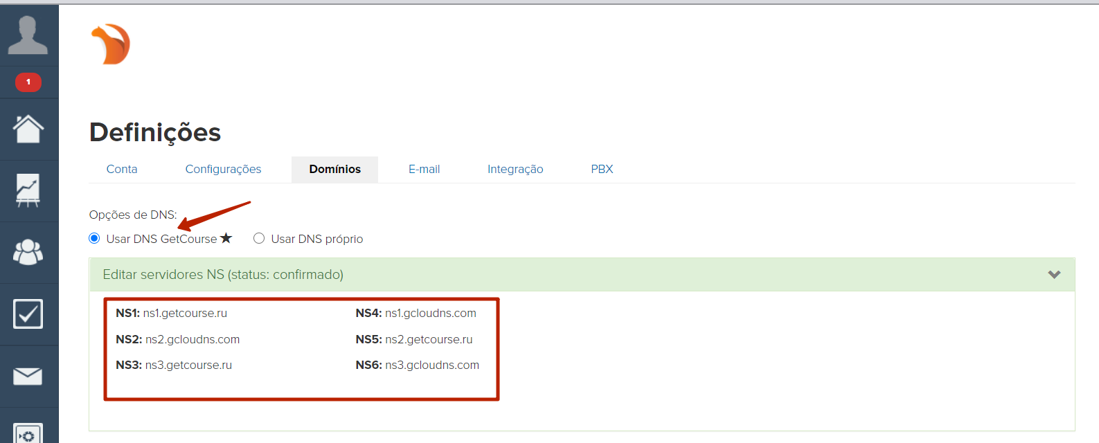1. Delegação de domínio nos servidores NS da GetCourse.