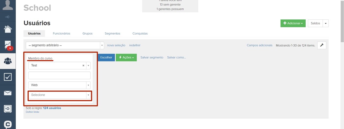 Para selecionar os usuários que entraram na lição com o webinar, você precisa criar um segmento de acordo com a condição "Participante do curso":