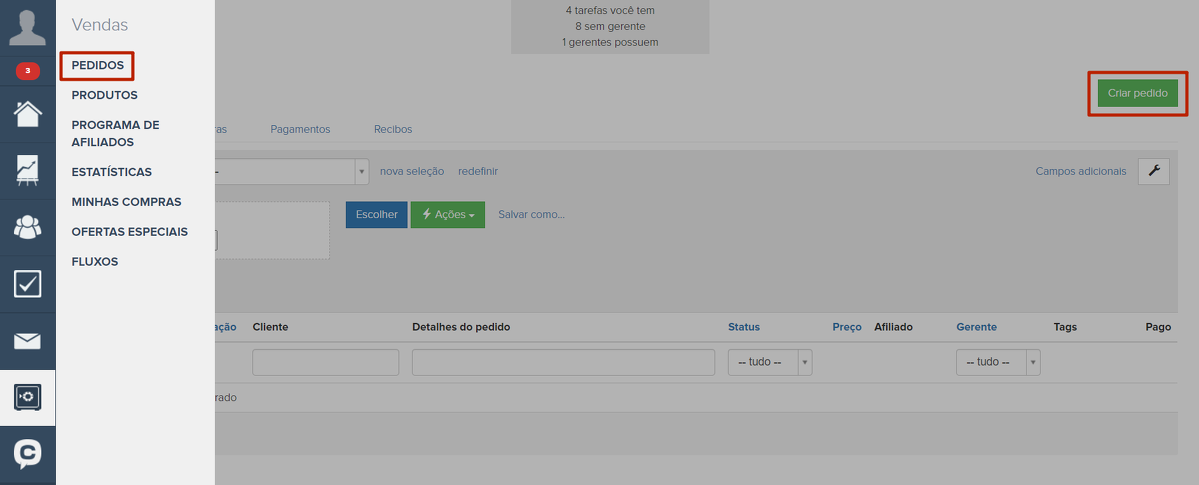 Vá para a seção "Pedidos", clique no botão "Criar pedido".