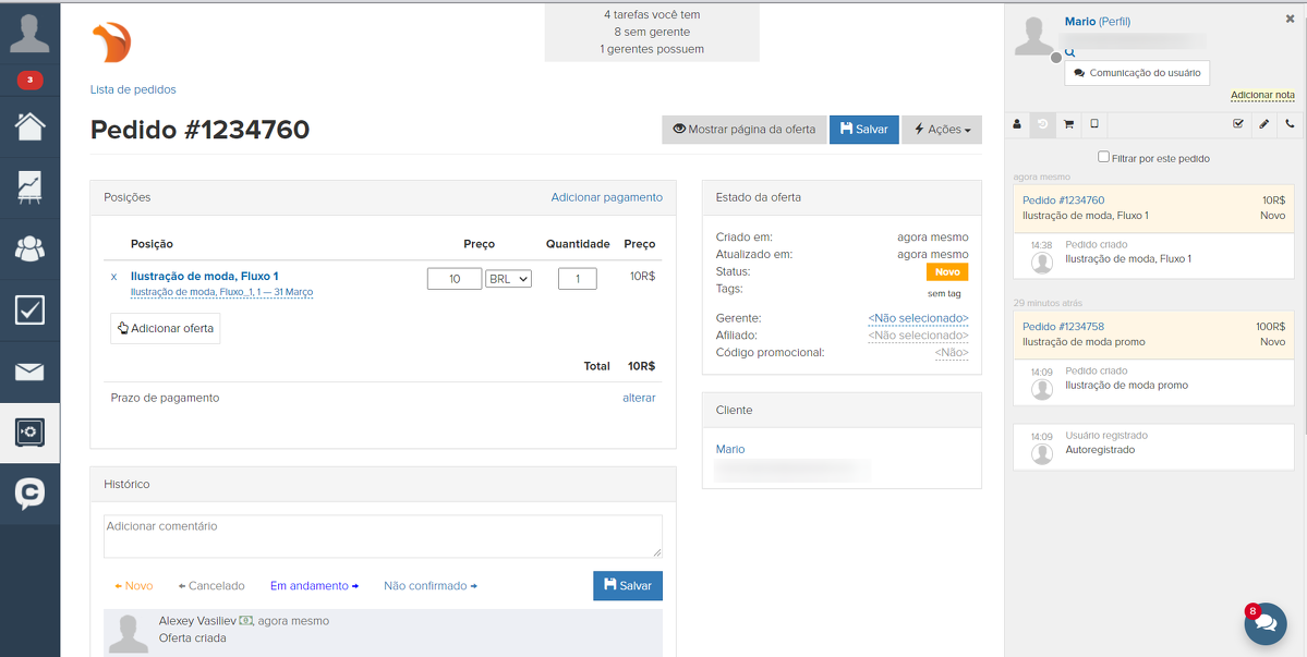 Após clicar no botão "Criar", o sistema te transferirá para o cartão do pedido. Aqui você pode alterar a composição do pedido, gerenciar o status do pedido, efetuar o pagamento manual, enviar o link de pagamento, atribuir um gerente ao pedido ou deixar um comentário sobre o pedido.