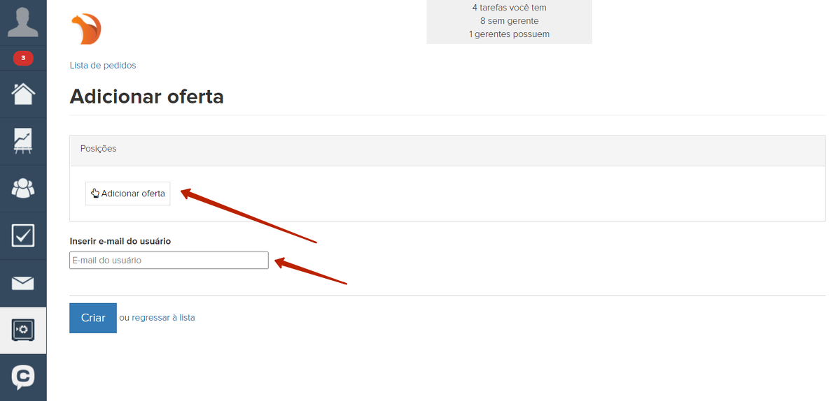Selecione uma oferta a partir da lista e indique o e-mail do usuário para o qual o pedido foi criado.