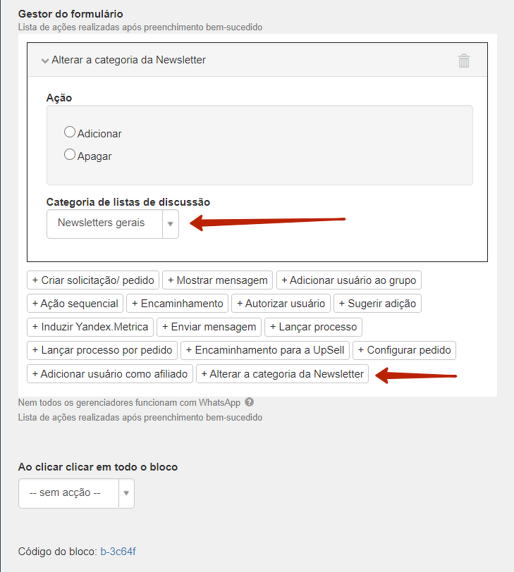 Você pode alterar a inscrição para a categoria de correspondência como resultado do preenchimento do formulário, adicionando a opção "Alterar categoria da Newsletter" nas configurações do bloco de formulário. Selecione a categoria a partir da lista e indique uma ação para ela.