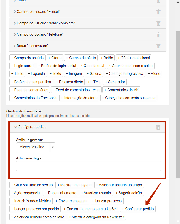 Nas configurações do bloco do formulário, adicione a opção "Configurar pedido", você pode atribuir um gerente para os pedidos criados através deste formulário ou colocar tags no pedido para fins de filtragem.