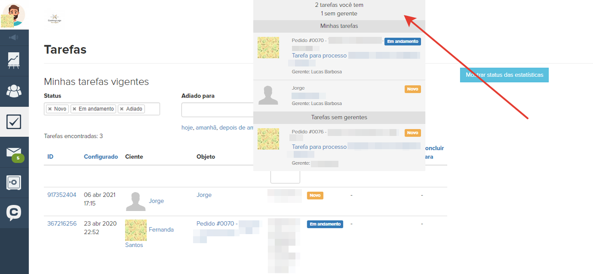 Ao clicar nesta barra, o gerente poderá visualizar suas tarefas com a informação do prazo de realização. As tarefas atrasadas serão exibidas no topo da lista. Quando um gerente clica em uma tarefa, ele é levado ao cartão do objeto (por exemplo, se uma tarefa for solicitada, o próprio pedido será aberto quando clicado).