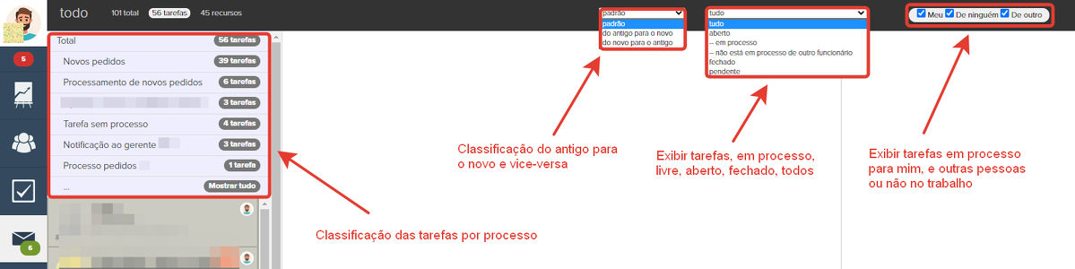 O filtro por atribuição - "Minha, de ninguém, de outros" permite exibir as tarefas em andamento daquele gerente, as tarefas sem gerente, assim como as tarefas executadas por outros gerentes.