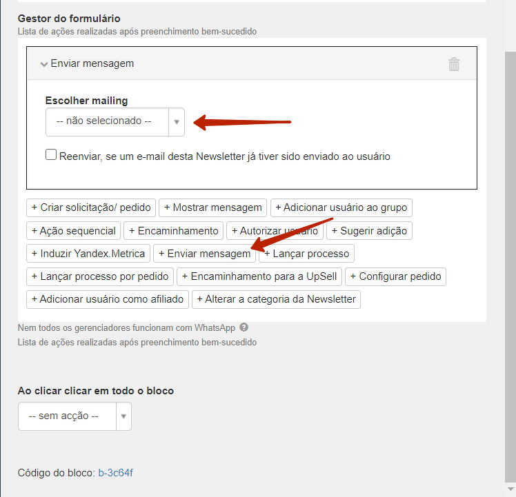 Para iniciar o envio de mensagens direto do formulário, adicione a opção "Enviar mensagem" no controlador do formulário e selecione a lista desejada.