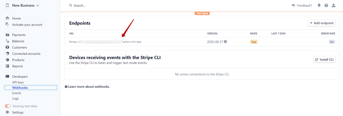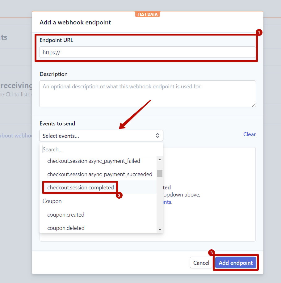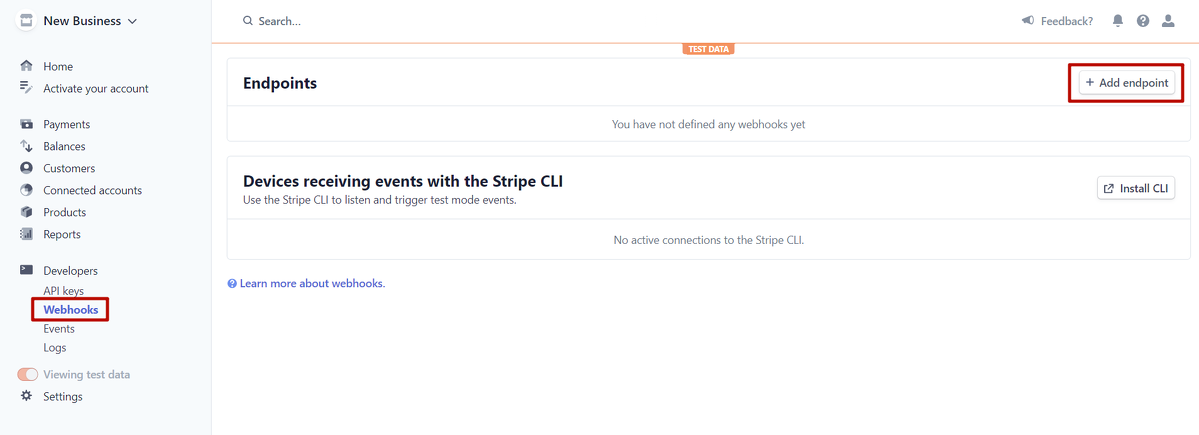 Em seguida, vamos para a seção "Webhooks" do sistema de pagamento e adicionamos os eventos.
