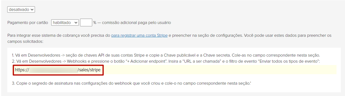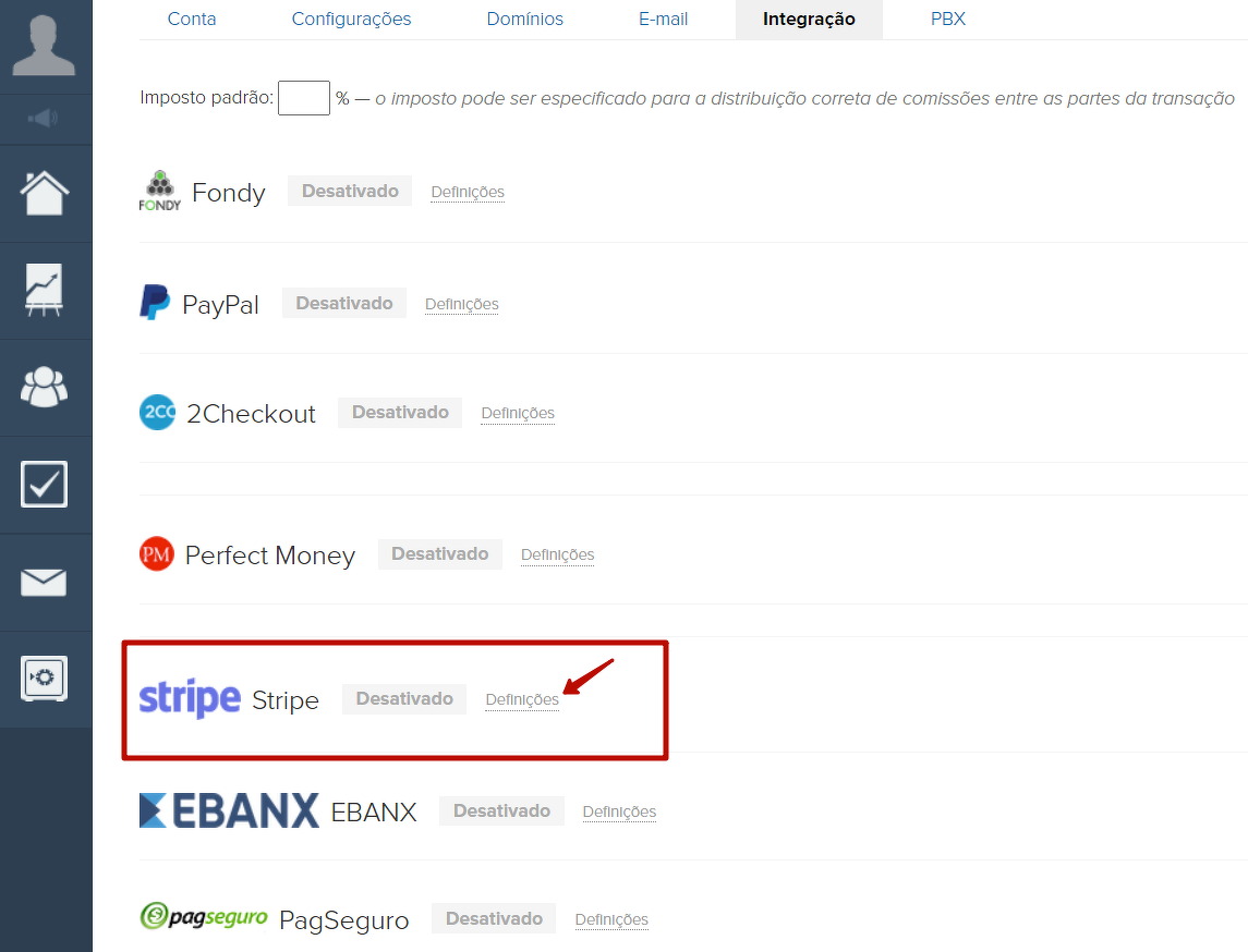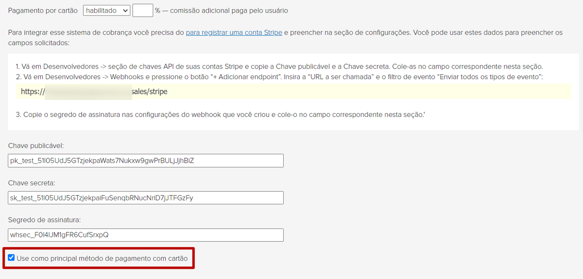 Nas configurações do sistema de pagamento "Stripe", você pode selecioná-lo como a principal forma de pagamento com cartão. Para isto, habilite a opção "Utilizar como principal forma de pagamento com cartão".